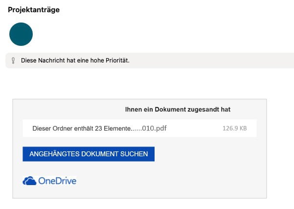 - Die E-Mail enthält einen Link, der auf ein valides und vertrauenswürdiges Ziel verweist, beispielsweise Microsoft Forms, OneDrive oder Dropbox.