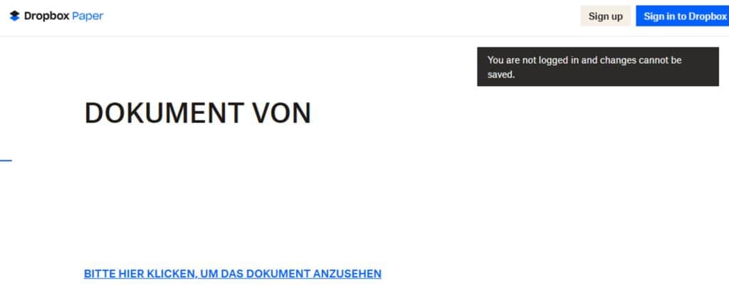 Hinweis: An allen Stellen (E-Mail, Dropbox-Paper Seite) wurde auf den korrekten und vollständigen Unternehmensnamen des Senders verwiesen. Wir haben dies zum Schutz der Daten aus den Darstellungen entfernt.